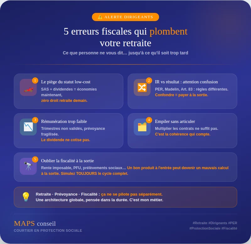 4ïžâƒŁ Empiler les dispositifs sans les articuler. Avoir plusieurs contrats ne suffit pas. Ce qui compte, c’est la cohĂ©rence fiscale et sociale de l’ensemble.
